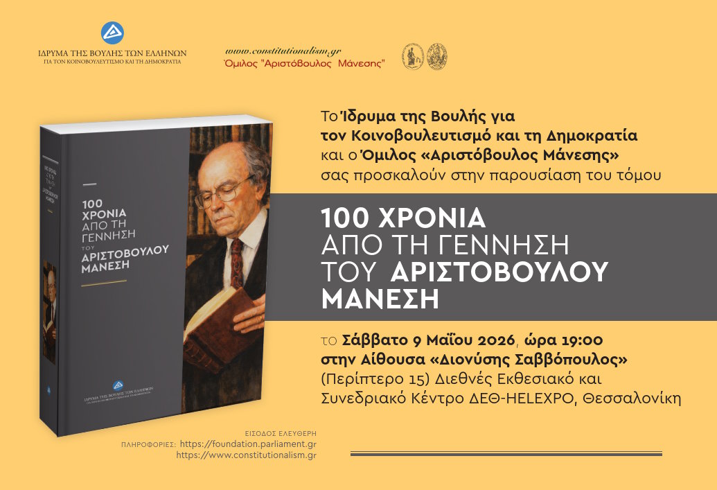 Ο Όμιλος «Αριστόβουλος Μάνεσης» και το  Ίδρυμα της Βουλής για τον Κοινοβουλευτισμό και τη Δημοκρατία σας προσκαλούν στην παρουσίαση του τόμου
