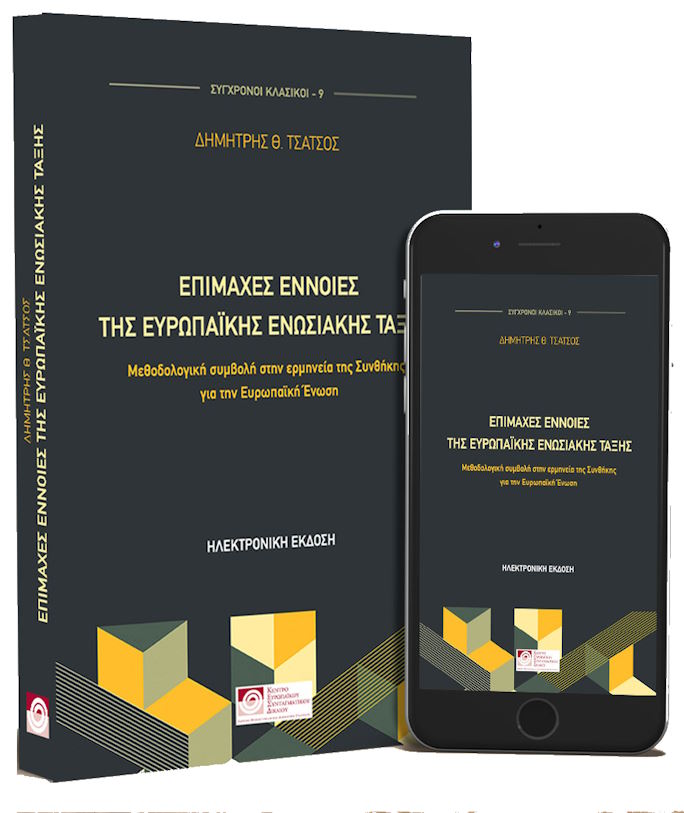Το Κέντρο Ευρωπαϊκού Συνταγματικού Δικαίου – Ίδρυμα Θεμιστοκλή και Δημήτρη Τσάτσου και το e-ΠΟΛΙΤΕΙΑ παρουσιάζουν, σε μορφή e-book ελεύθερης πρόσβασης, το κλασικό έργο του Δημήτρη Θ. Τσάτσου, με τίτλο «Επίμαχες έννοιες της ευρωπαϊκής ενωσιακής τάξης. Μεθοδολογική συμβολή στην ερμηνεία της Συνθήκης για την Ευρωπαϊκή Ένωση», με νέο Πρόλογο του Καθηγητή Ευρωπαϊκού Δικαίου στο ΕΚΠΑ Αντώνη Μεταξά.
